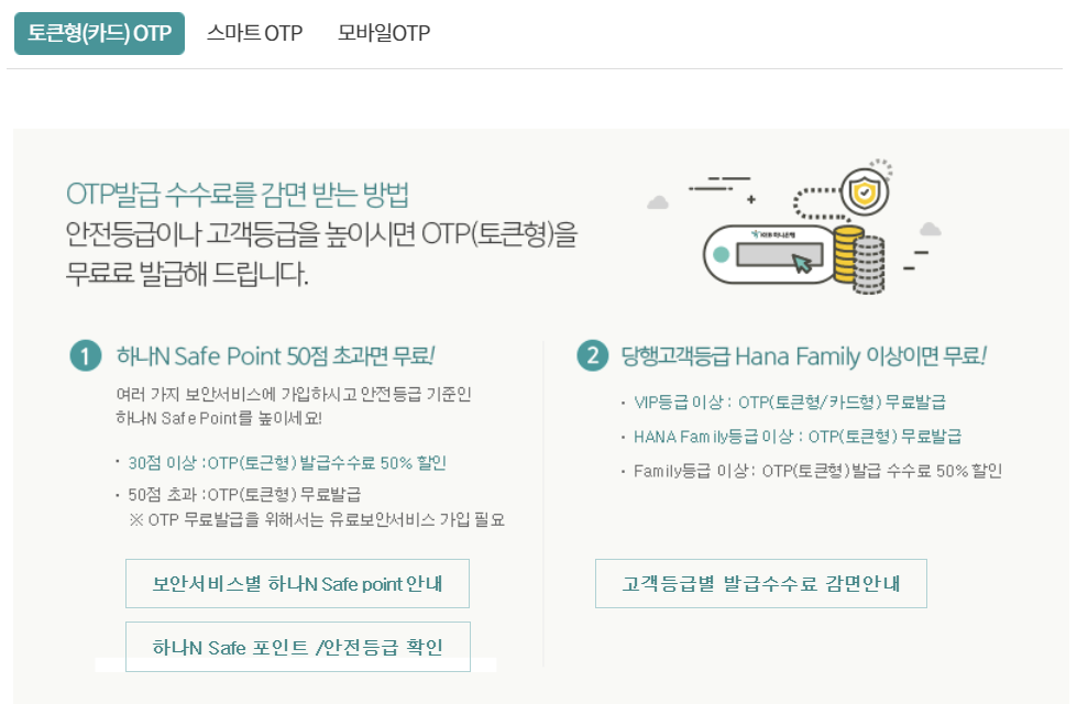 아래의 하나 N safe 점수가 50점을 초과하거나, 하나은행 Family 이상이면 토큰형 OTP 발급이 무료입니다.