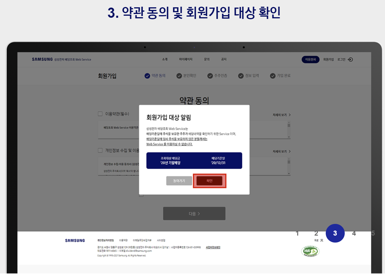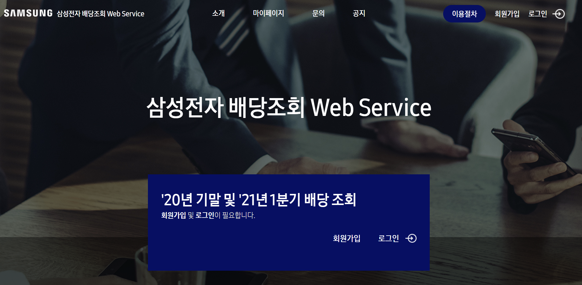 '20년 기말 및 '21년 1분기 배당 조회 회원가입 및 로그인이 필요합니다. 회원가입 로그인 삼성전자 배당조회 Web Service란? 배당기준일에 삼성전자 주식을 보유하신 주주분들이 배당내역을 확인하