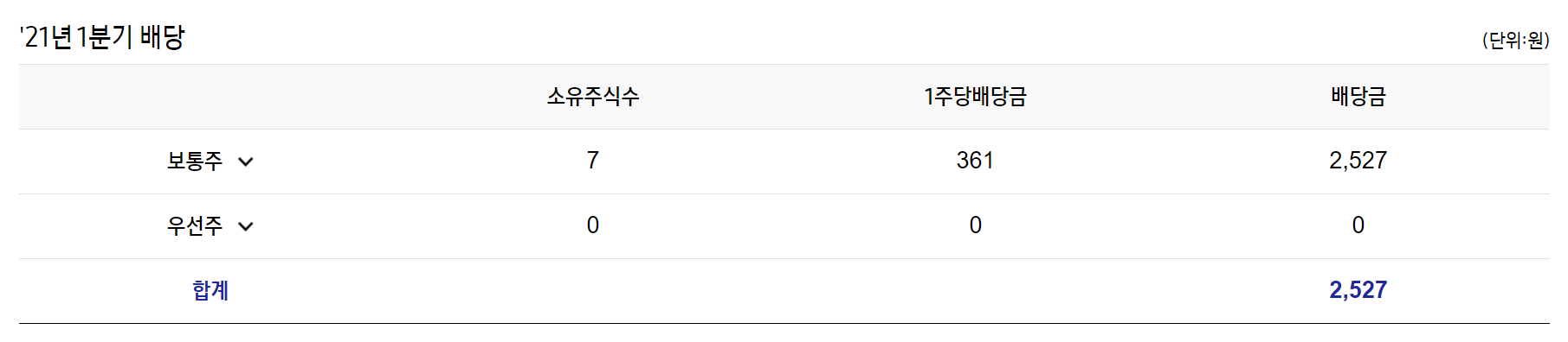 21년 1분기 배당의 경우 저는 7주를 가지고 있어서 주당 361원씩하여 2,527원을 배당 받았습니다. ㅎㅎㅎ