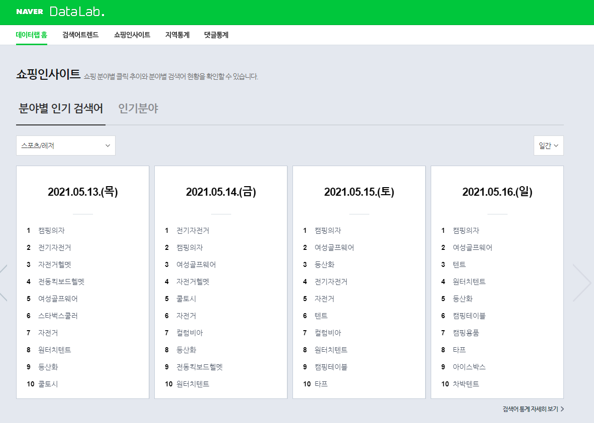 네이버의 검색 트렌드 및 급상승검색어 이력, 쇼핑 카테고리별 검색 트렌드 제공
