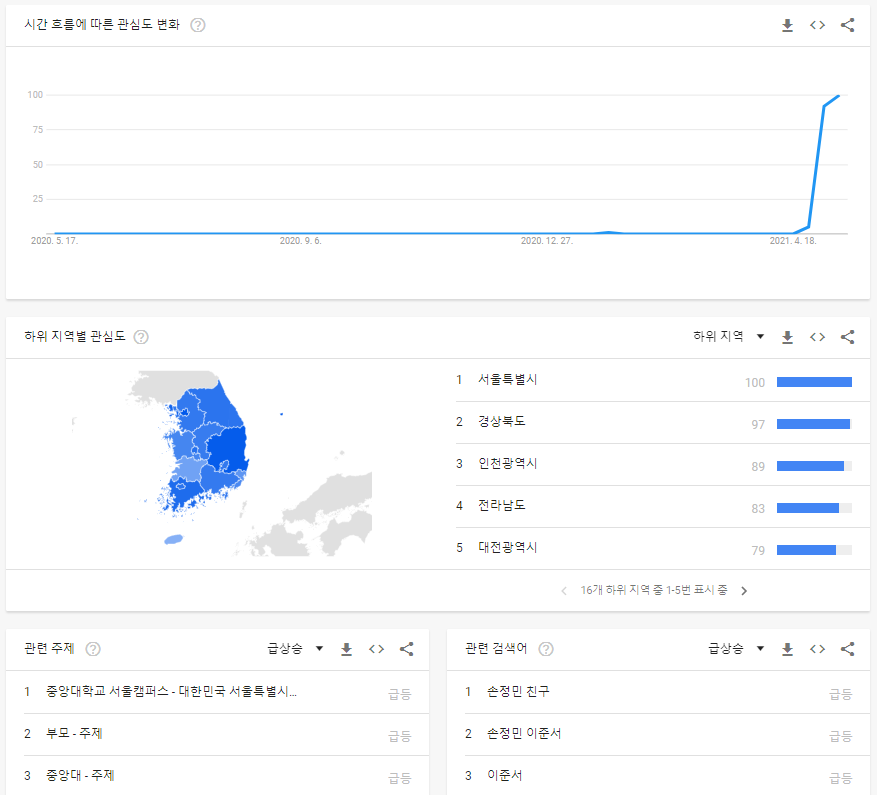 아래처럼 지역별 관심, 관련주제, 관련 검색어 등이 나옵니다.
