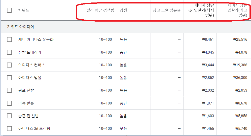 즉 운동화의 경우 '제니 아디다스 운동화'가 최저 CPC가 높고 월간 약 100건 정도 조회가 되며, 경쟁은 높다라는 것을 알 수 있습니다.