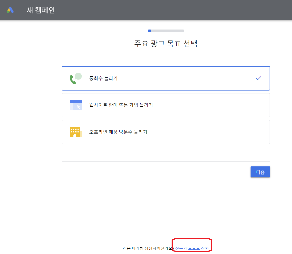 구글 계정으로 로그인하신 다음 새 캠페인에서 하단의 전문가 모드로 전환을 누릅니다.