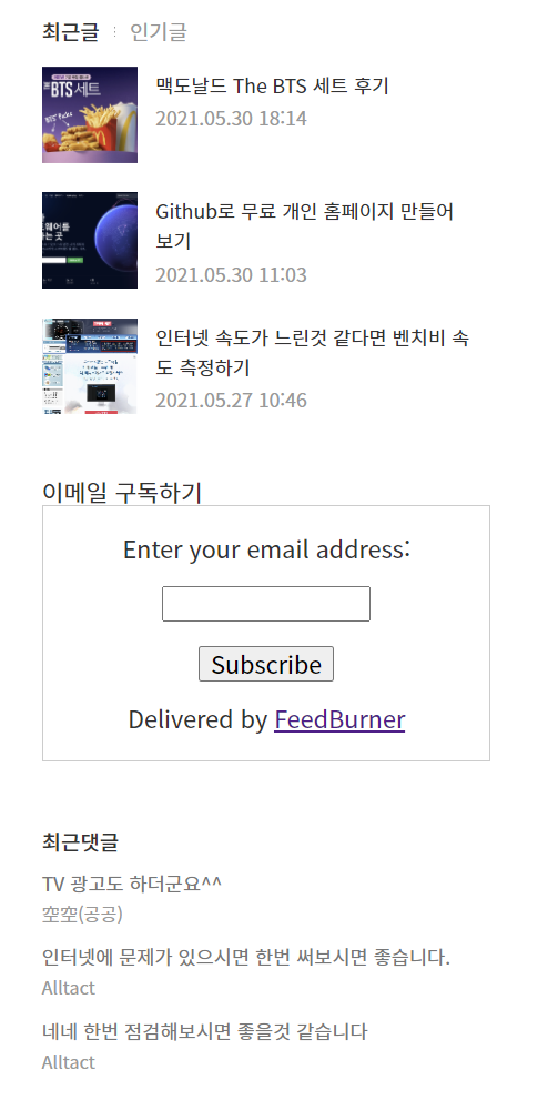오늘은 Feedburner를 통해서 이메일 구독을 할 수 있는 방법을 알아보겠습니다.