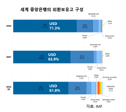 세계 중앙은행의 외환보유고는 아래처럼 달러 유로화,엔화 순입니다.