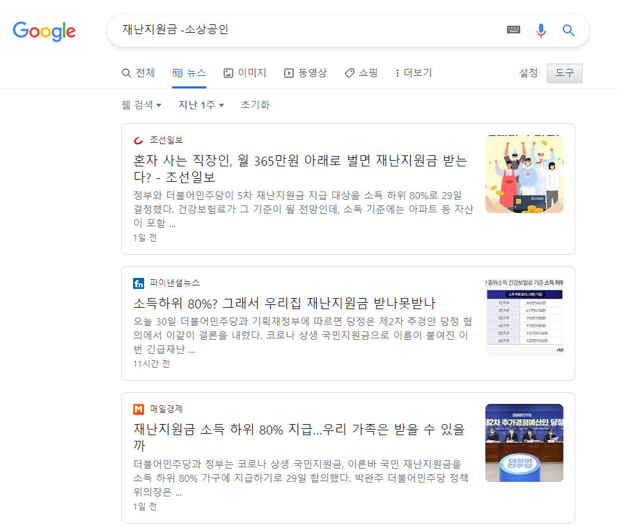 아래는 재난지원금을 검색할때 소상공인을 제외한 결과만을 보여줍니다.