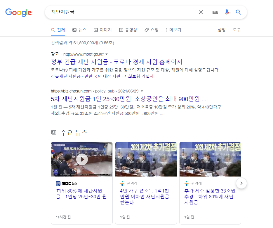같은 재난지원금을 구글에서 검색해보겠습니다.