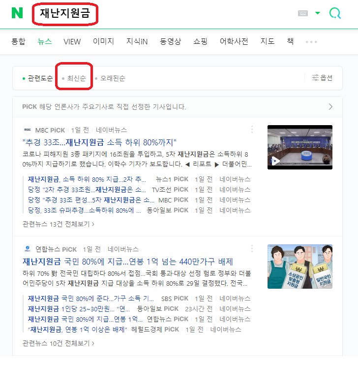 먼저 네이버 검색엔진에서 검색하면 아래처럼 제가 재난 지원금에 대해서 검색을 하고,