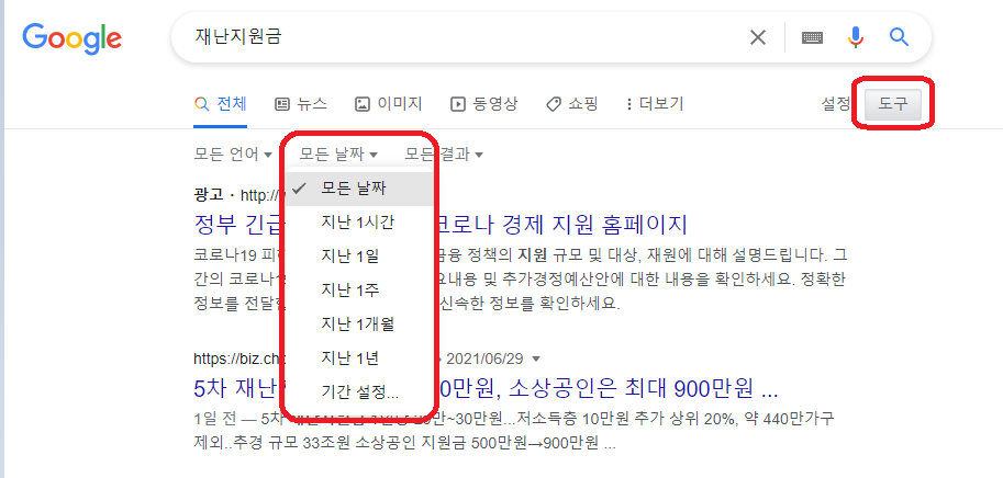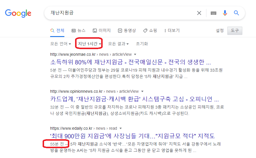 모든 날짜로 검색할 때와 우측의 지난 한시간으로 고정해서 검색한 결과가 다름을 알 수 있습니다.