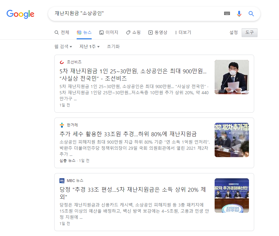 꼭 포함해야할 글자는 ""로 묶어주시면 됩니다. 재난지원금에 꼭 소상공인이 들어가는 검색결과구요.