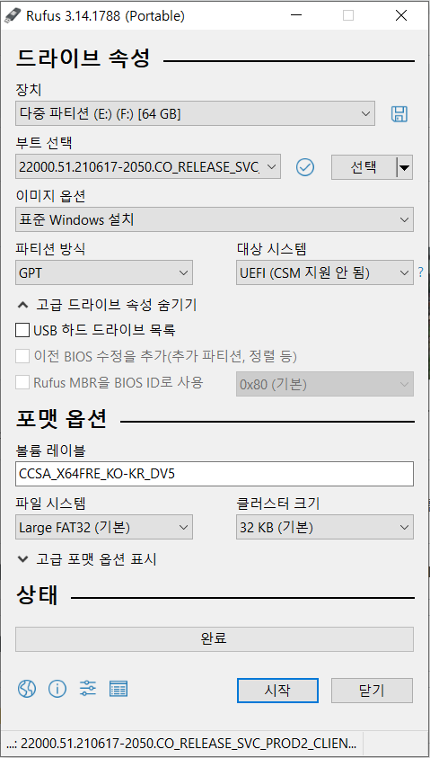 그리고 시작을 누르면 윈도우 11 설치가 가능한 USB가 만들어졌습니다.