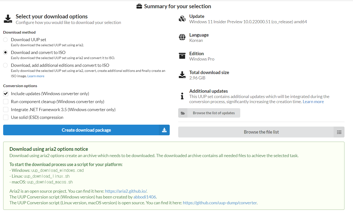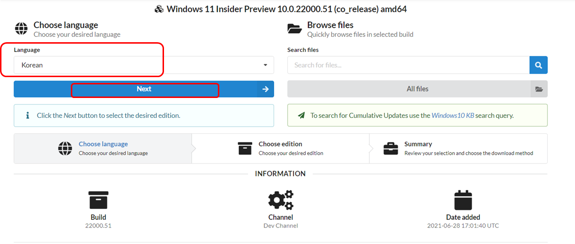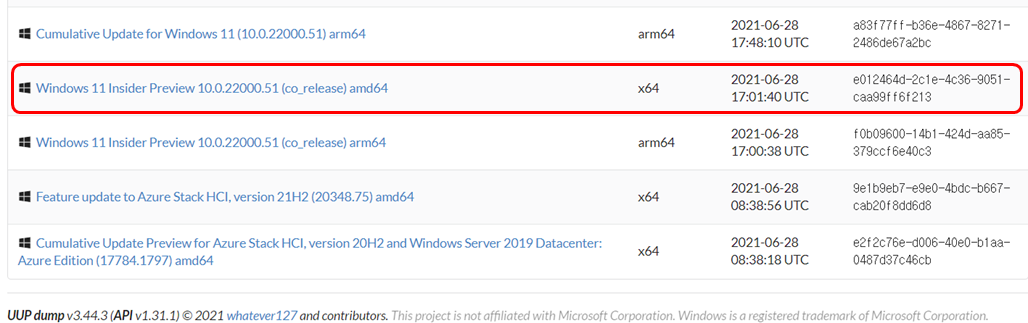 위의 UUPDUMP에 들어가서 하단에 있는 Windows 11 Insider Preview 10.0.22000.51(co_release)amd64