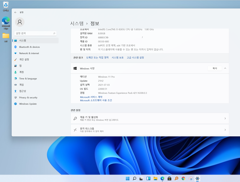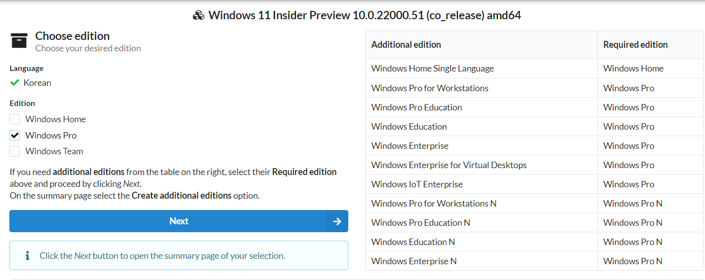 Summary for Windows 11 Insider Preview 10.0.22000.51 (co_release) amd64, Korean, Windows Pro