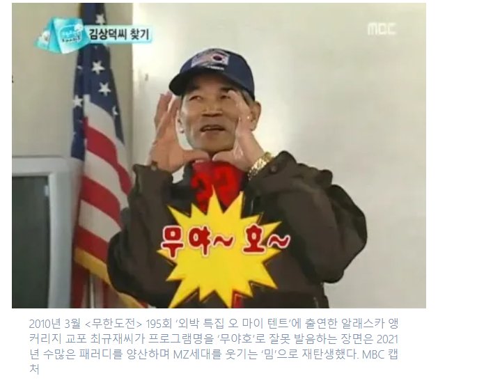 그리고 2010년 무한도전을 알래스카 교포 최규재씨가 '무야호'로 잘 못 발음하는 장면등은