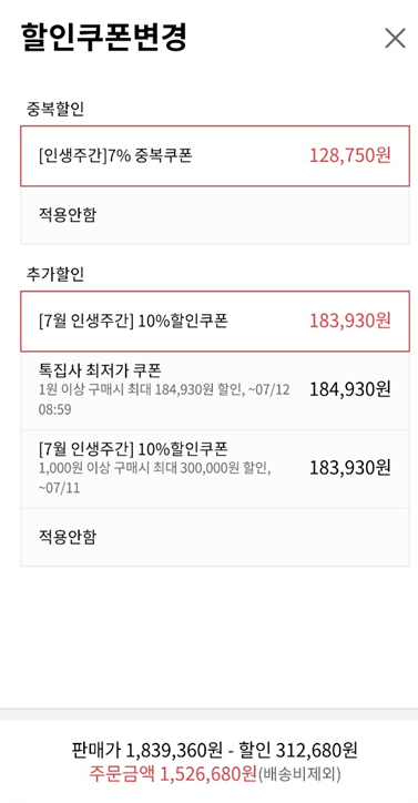 인터파크앱에서 롯데카드로 결제시 청구할인 포함하여 138만원입니다.