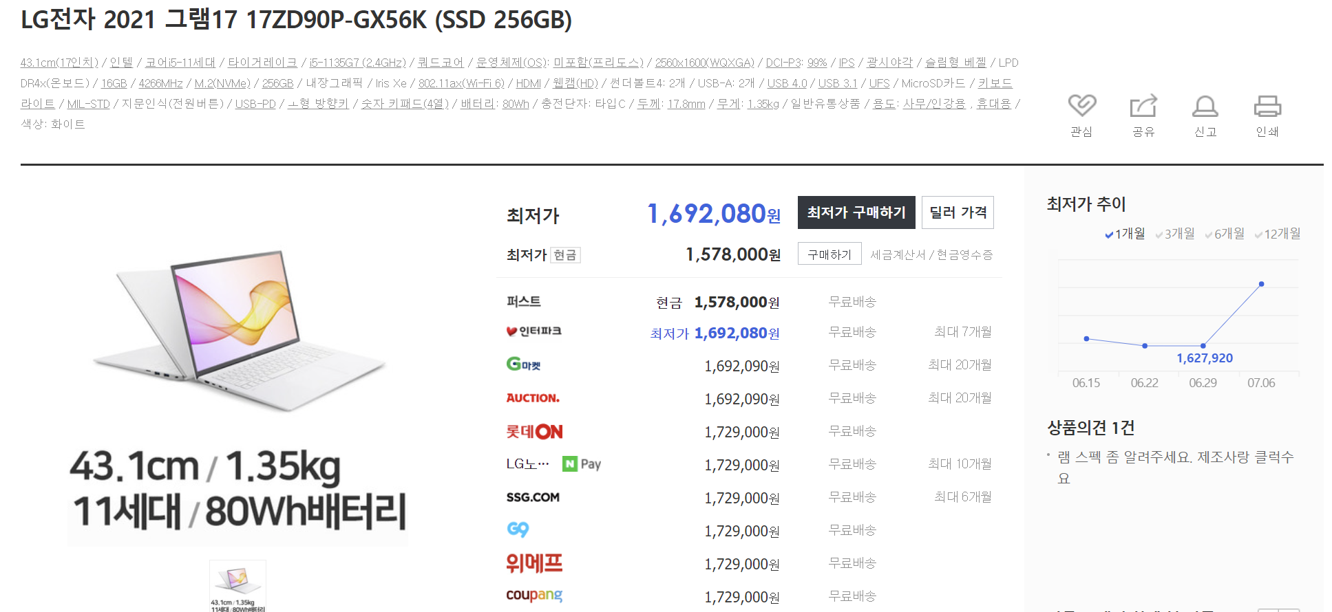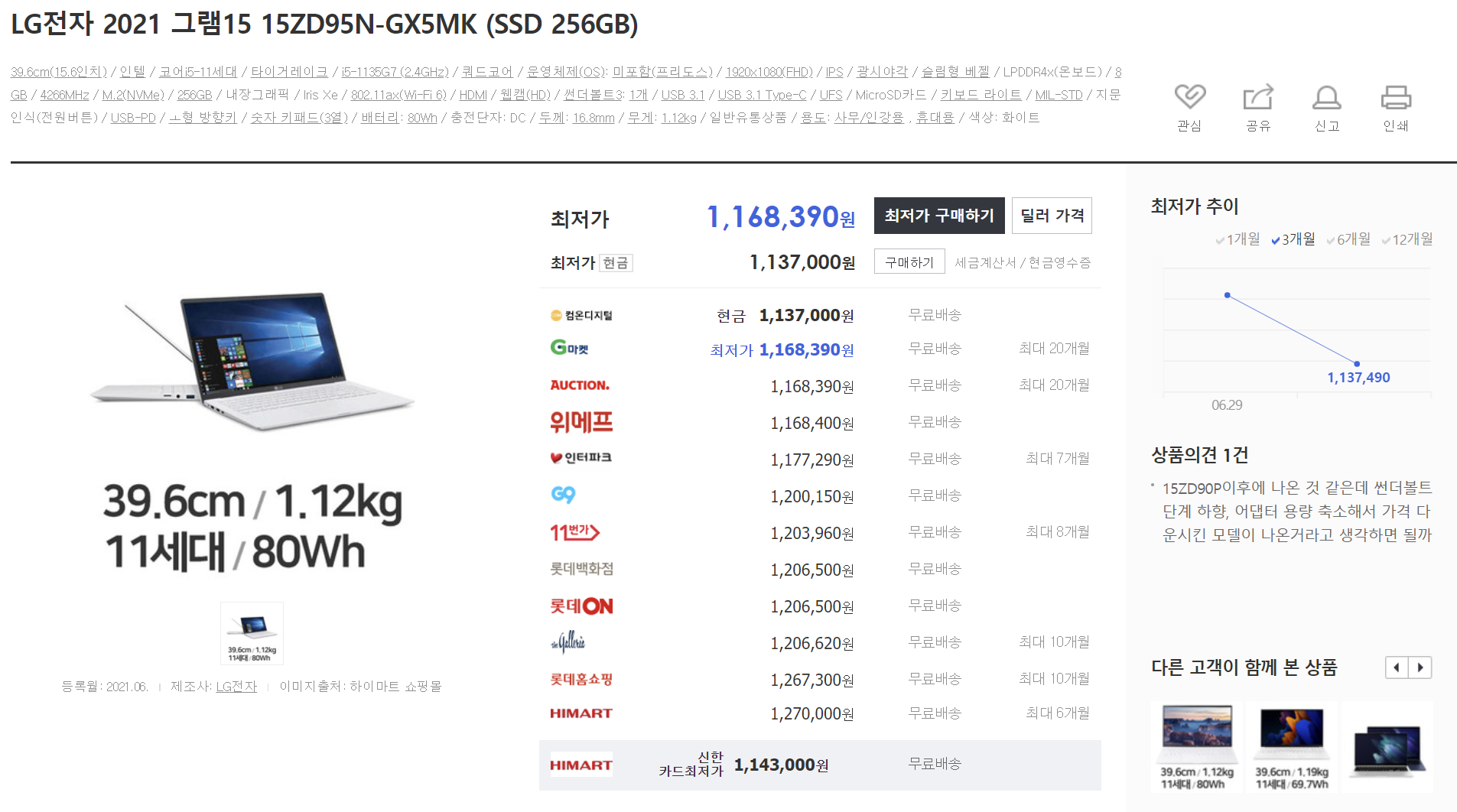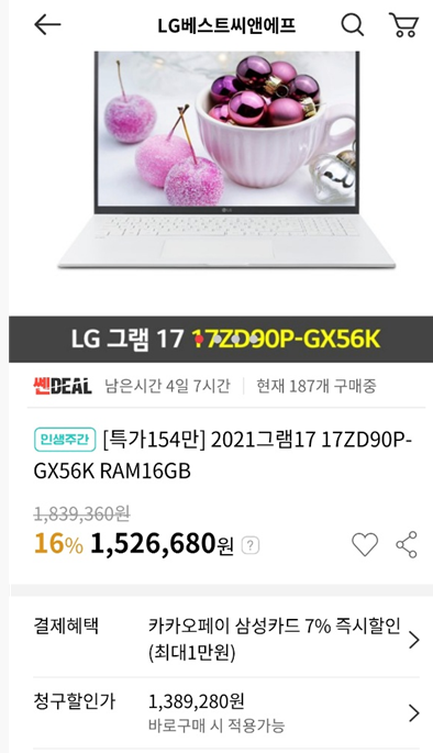 21년형 그램 17인치를 구매하실 예정이라면 현재 최저가이니 구매하셔도 괜찮을 것 같습니다.