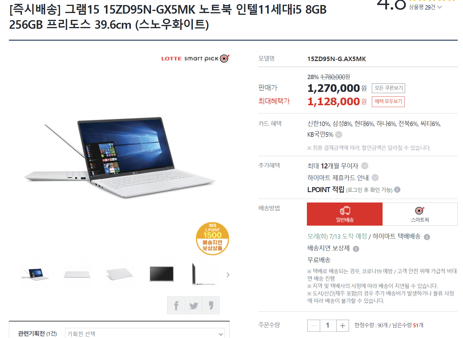 롯데하이마트 | [즉시배송] 그램15 15ZD95N-GX5MK 노트북 인텔11세대i5 8GB 256GB 프리도스 39.6cm (스노우화이트) (e-himart.co.kr)