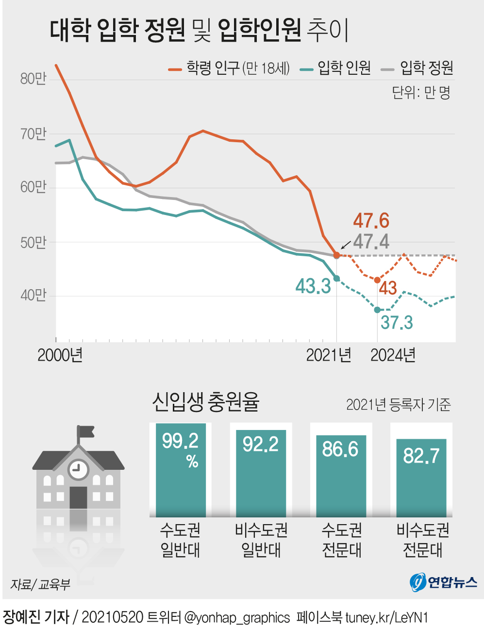 21년 기준 학령인구가 47.6만명, 입학정원이 47.4만명이고, 실제 입학 인원은 43.3만명이라고 합니다.