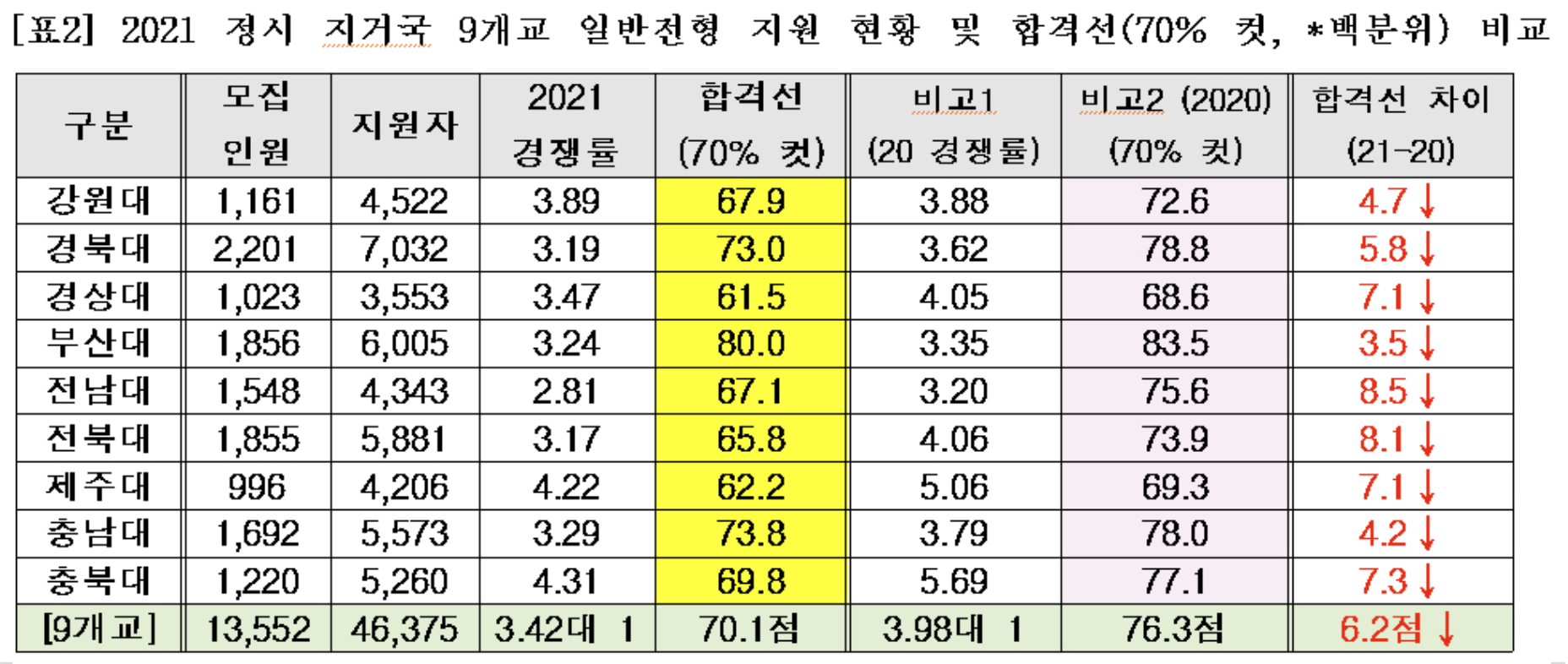 전남대의 경우 합격선이 8.5점이나 낮아졌습니다.