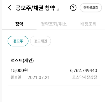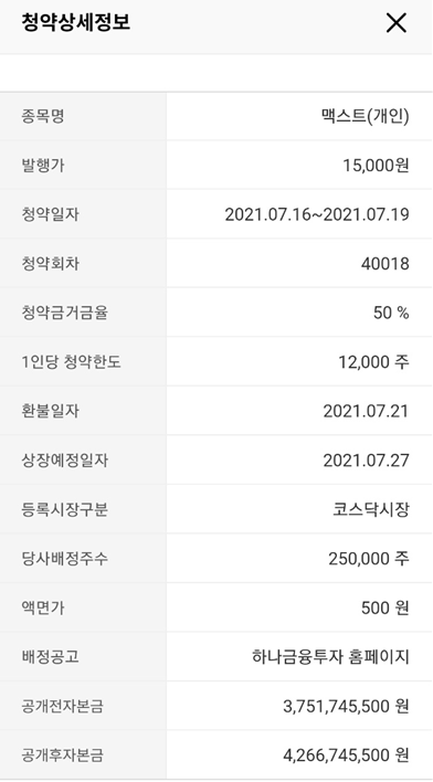 맥스트는 특이하게 2주 동안 청약을 했고요. 7월 16일부터 19일까지 청약을 했습니다.