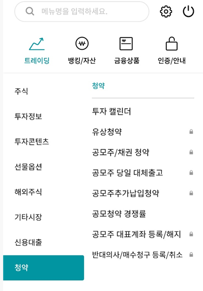 메뉴 -> 청약 -> 공모주/채권 청약에서 공모주를 청약할 수 있습니다.