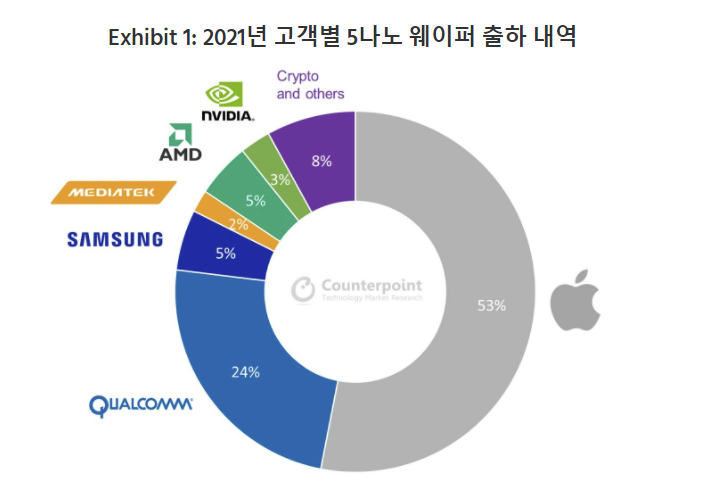 5 나노 웨이퍼 출하 내역 중 53%가 애플입니다.