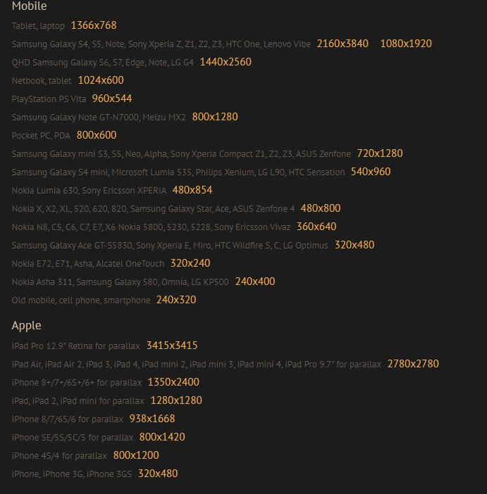 그리고 스마트폰용, 태블릿용 해상도도 모델명별로 추천해주고 있습니다.