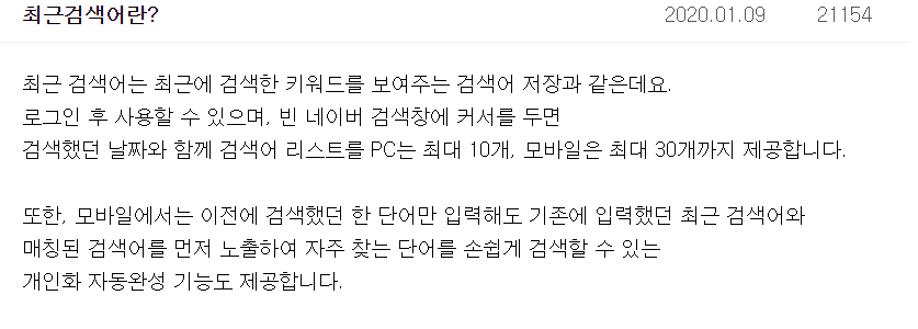 네이버에서 최근에 검색한 키워드를 보여주는 기능인데요.