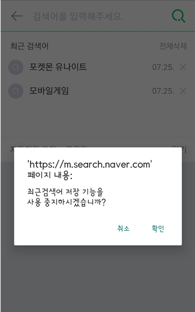 이렇게 설정하시면 이제는 최근검색어가 뜨지 않습니다.