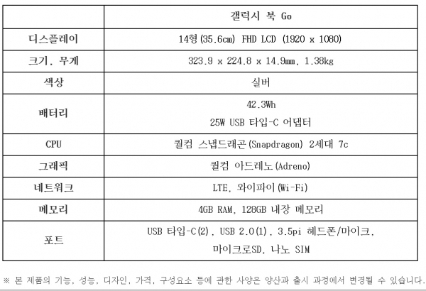14인치 FHD 모니터에, 1.38KG의 무게를 가지며 퀄컴 스냅드래곤 2세대 7c가 장착되었습니다.