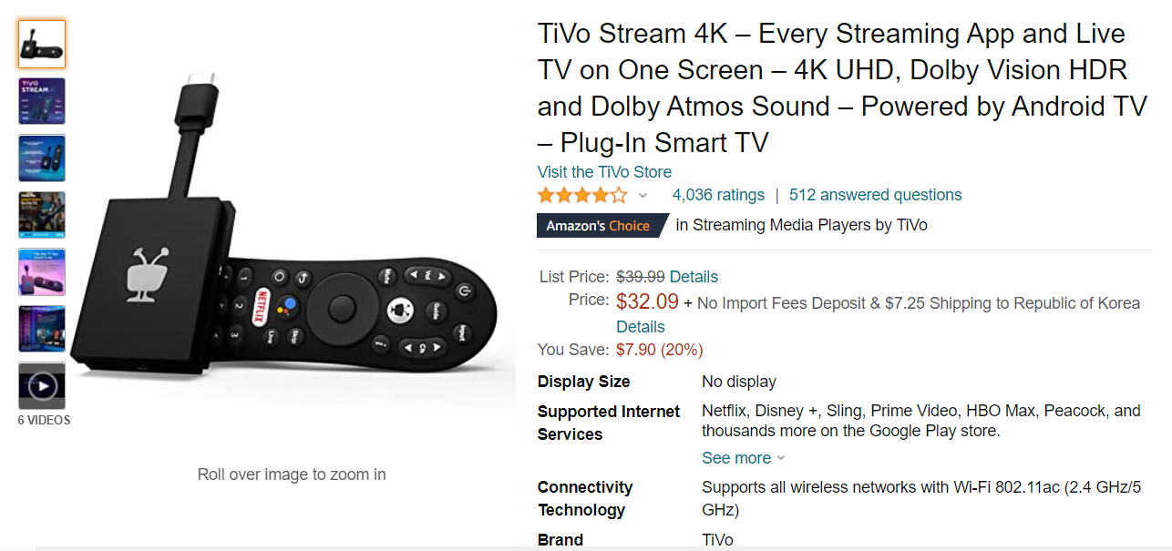 아마존에서 Tivo Stream 4K를 세일해서 구매해보았습니다.