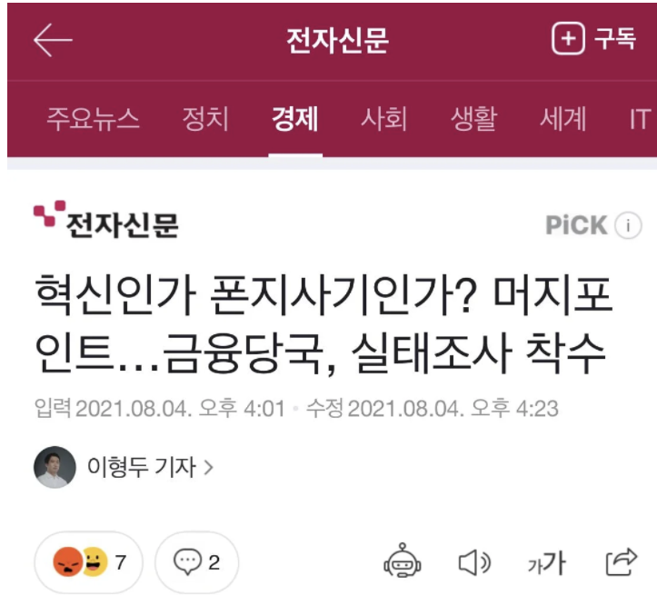 최근 머지포인트 관련하여 기사가 한번 난적이 있습니다. 당시 머지 포인트 관련하여 혁신인가 폰지사기인가? 머지포인트... 금융당국, 실태조사 착수라는 이름의 전자신문발 기사가 났었는데