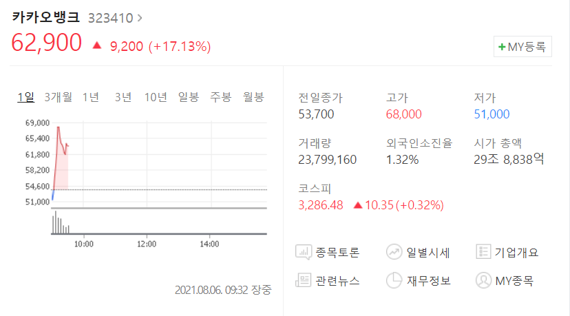 그리고 오늘 카카오뱅크는 장중에 거의 상한가까지 한번 갔다왔는데요.