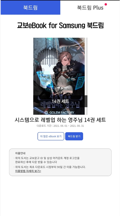 북드림 Plus에서는 시스템으로 레벨업 하는 영주님 14권 세트를 90일간 대여해서 볼 수 있습니다.