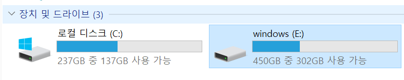컴퓨터에 연결하면 기존의 하드와 이렇게 USB로 연결한 하드가 보이는데요.