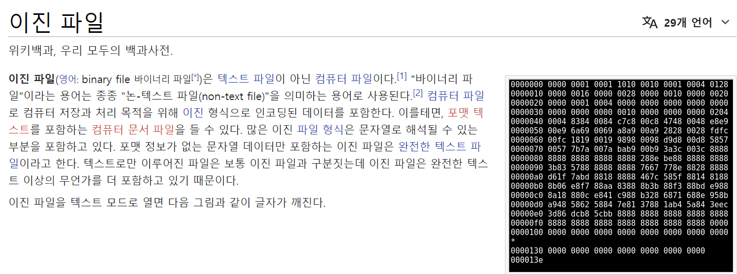 이진파일이라 불리우며 컴퓨터의 저장과 처리 목적을 위해 이진 형식으로 인코딩된 데이터를 말합니다.