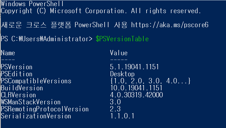 그리고 파워셀 버전은 $PSversionTable 명령어를 통해서 확인하실 수 있습니다.