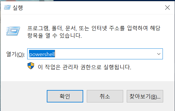 윈도우 + R 키를 통해 실행을 연다음 powershell을 입력하고 확인을 눌러서 powershell을 실행합니다.