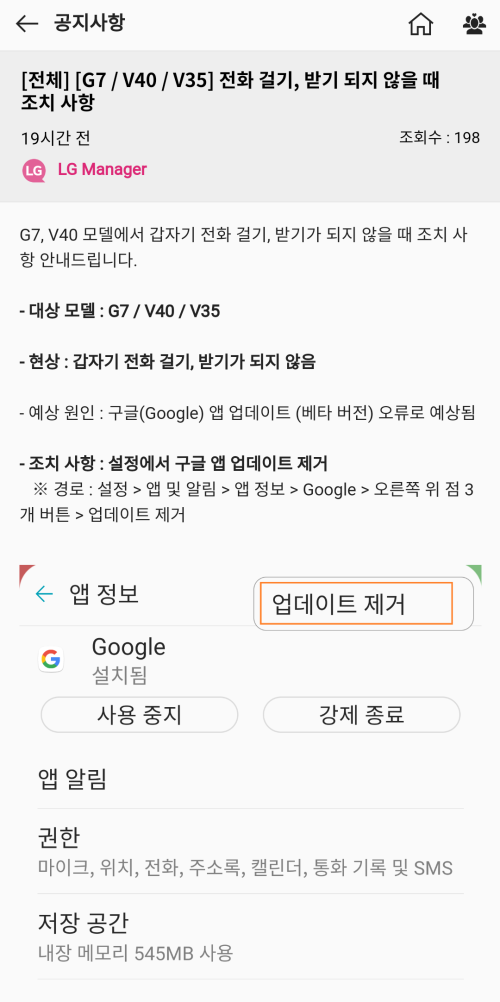 LG전자에 따르면 구글 앱에서 업데이트를 제거하면 해결할 수 있다고 합니다.