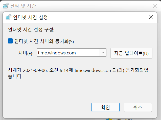 time.windows.com으로 입력하고 지금 업데이트를 누르시면 됩니다.