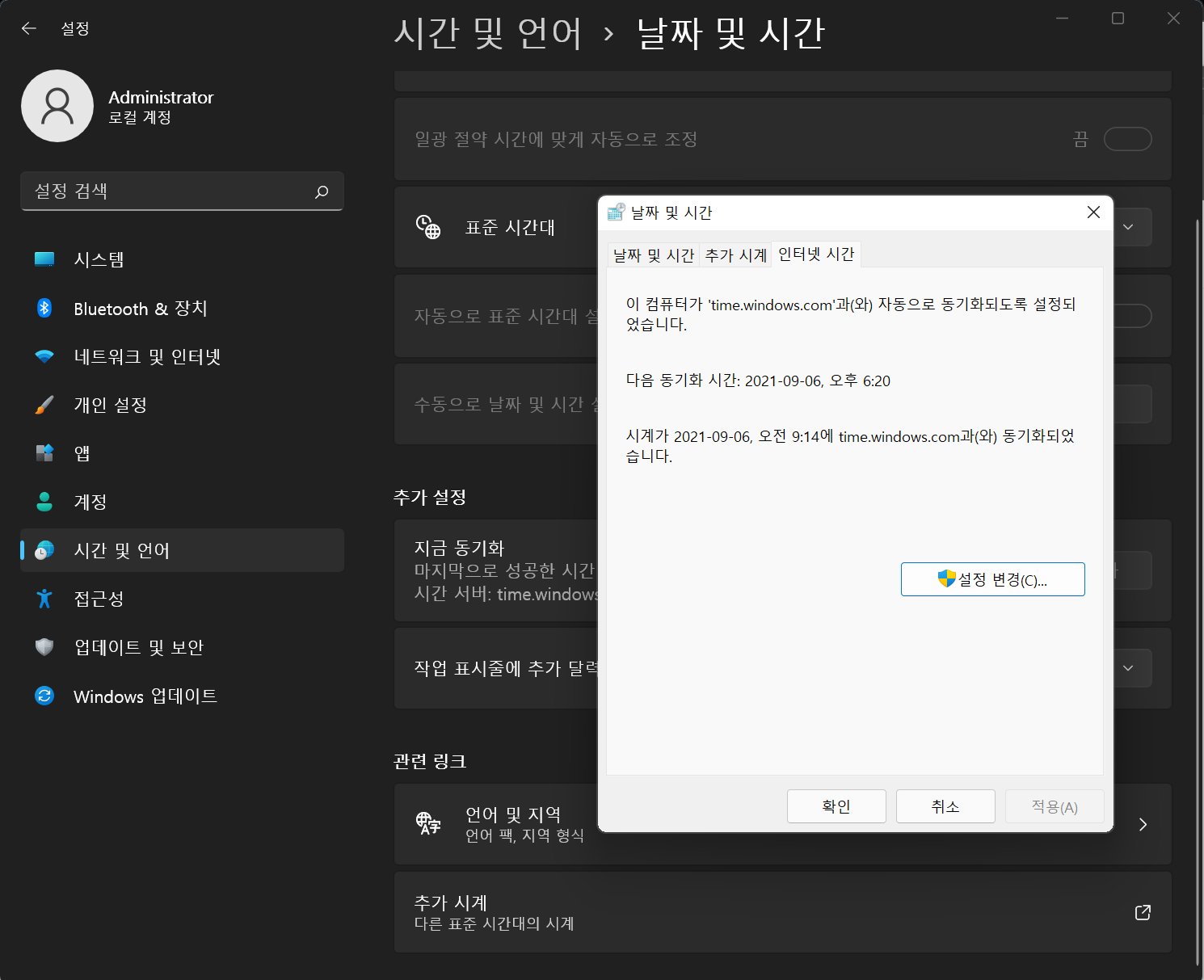 여기서 인터넷 시간 서버와 동기화에 체크하시고
