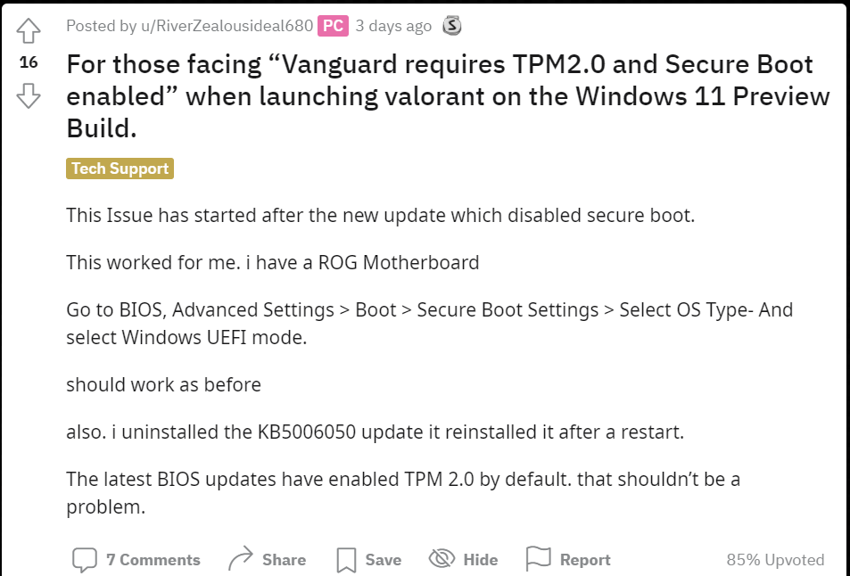 현재 윈도우 11에서 발로란트 플레이 시 This build of Vanguard requires TPM version 2.0 and secure boot to be enabled in order to play 에러 메시지가 나타나고 있습니다.