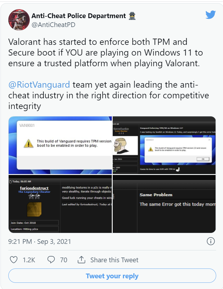현재 Riot의 Valorant는 TPM(Trusted Platform Module) 2.0 및 보안 부팅이 지원되지 않는 PC에서 실행이 되지 않습니다.