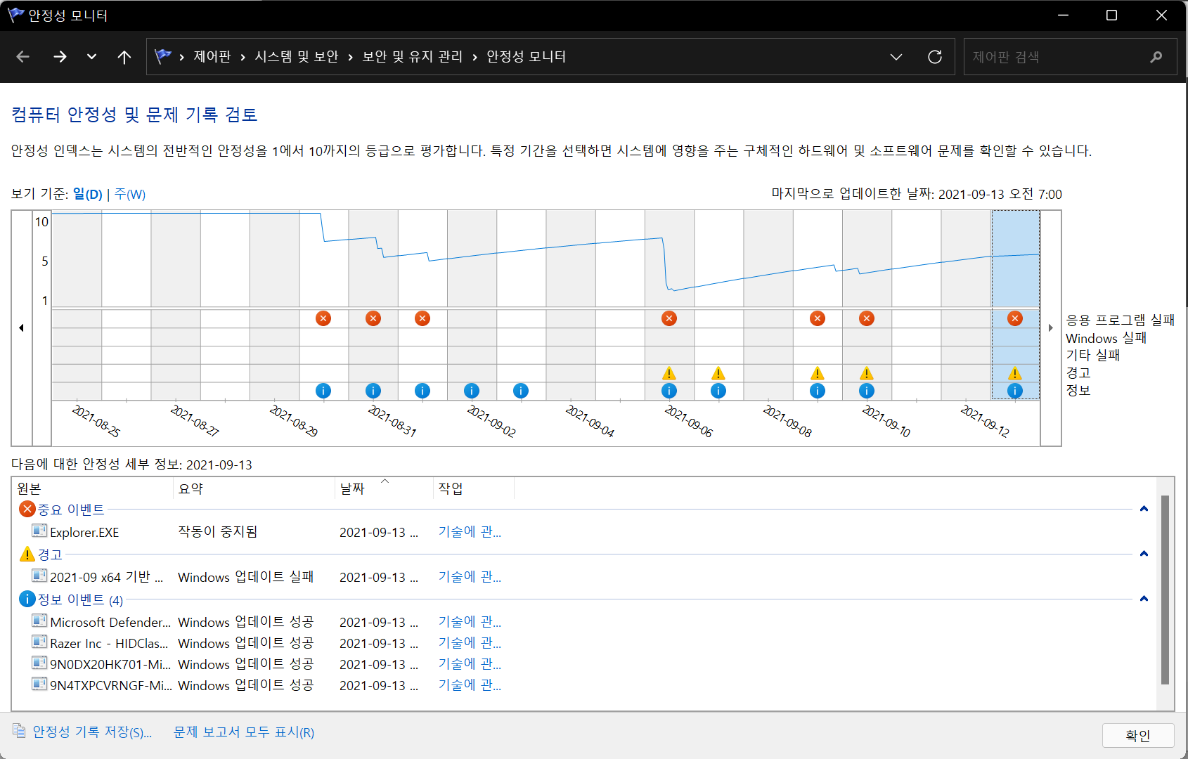 안정성 기록 보기를 실행하시면 됩니다.