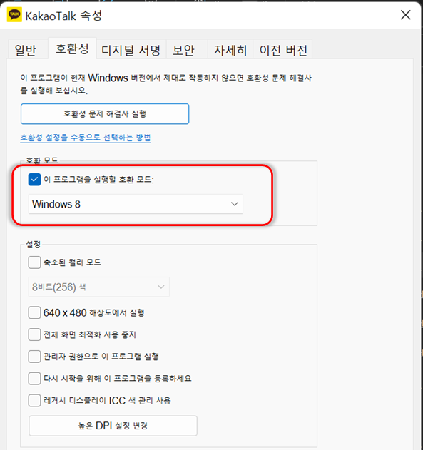 혹시 윈도우 11 사용중에 자주 카카오톡이 꺼진다면 호환성 모드를 변경하여 사용해보시기 바랍니다.