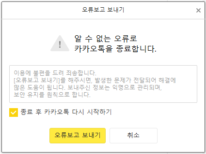 알 수 없는 오류로 카카오톡을 종료합니다.라는 메시지를 종종 보게 됩니다.