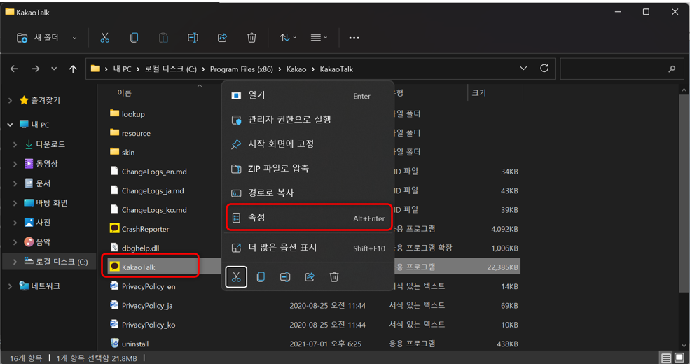 카카오톡 실행파일을 찾으시고 마우스 우클릭 -> 속성을 클릭합니다.