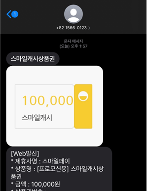 아래와 같이 문자로 스마일캐시상품권으로 상품권 번호와 함께 발송됩니다.