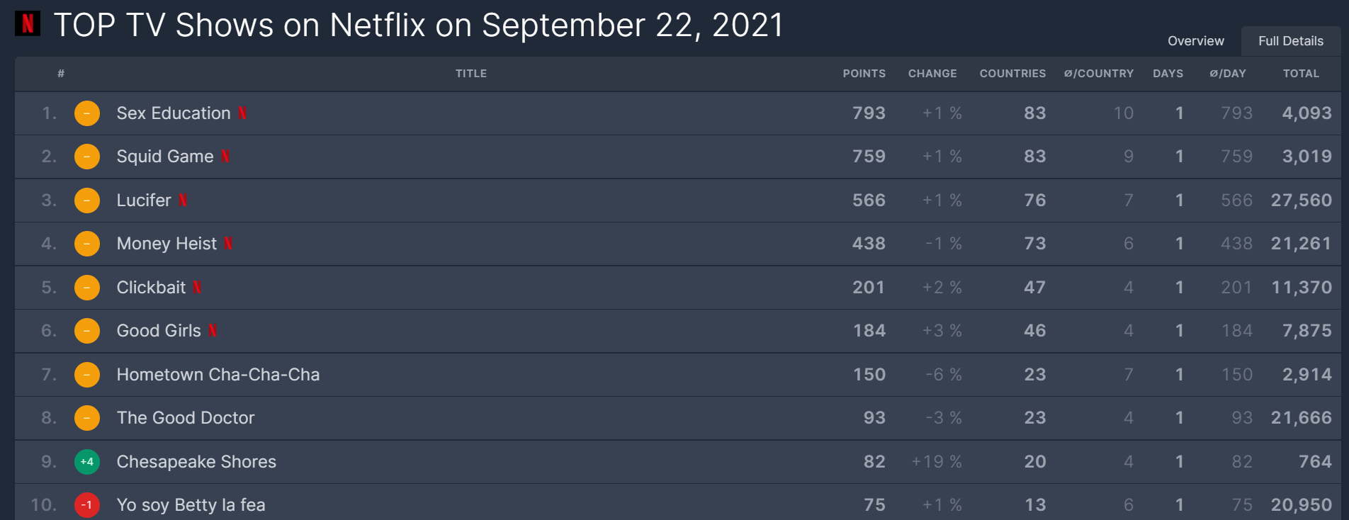 아래 자료를 보면 1등에 Squid Game(오징어 게임)이 위치한 것을 알수 있습니다.