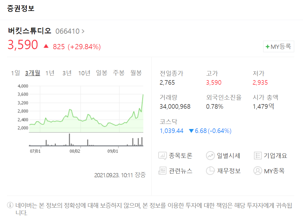 버킷스튜디오 (3,590원 상승825 29.8%)는 전 거래일 대비 825원(29.84%) 오른 3,590원으로 바로 상한가가 되었습니다.